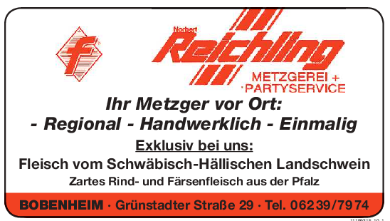Die besondere Atmosphäre in einem Familienbetrieb, in dem man noch mit Namen begrüßt wird, schätzen viele Kunden, die in die Metzgerei Reichling kommen. Ausschlaggebend aber ist die gleichbleibend gute Fleisch- und Qualität der Wurstwaren und die persönliche Beratung.