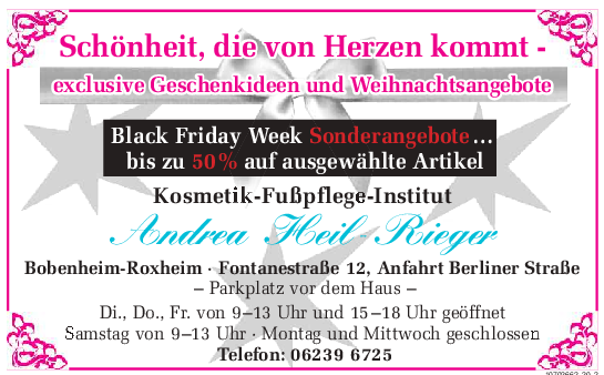 Elke Wunderle tritt ab 18.30 Uhr unter dem Motto „Soul Chrismas“ auf. An 17 Ständen wird gebrutzelt oder ausgeschenkt. Etliche Vereine engagieren sich dabei, wie der Förderverein Feuerwehr, der Würfelclub, SV 1914 Tennis, der Roxheimer Carneval Verein, der Deutsch-Französische Freundeskreis, Freundeskreis Rheinschule sowie Gastronomen, ein Metzger, ein Weingut und Privatpersonen. Neben den üblichen Bratwürsten und Kartoffelpuffern werden Spieẞbraten, Pizza, Arancini, Kartoffelcremesuppe, Tortellini und mehr kredenzt. Zum Abschluss am Sonntag, 7. Dezember, von 15 bis 20 Uhr tritt um 15.30 Uhr der Kinderchor Rheinschule auf, ab 17 Uhr der Don-Bosco Kinder- und Jugendchor. ma