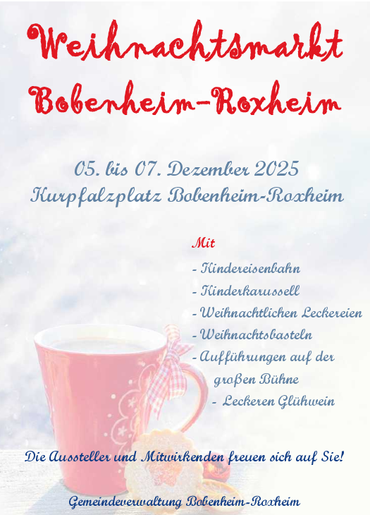 Drei Tage lang können Besucher auf dem Weihnachtsmarkt in Bobenheim-Roxheim die vorweihnachtliche Freude im Ort genießen. Von Freitag, 5. Dezember bis einschließlich Sonntag, 7. Dezember werden auf dem Kurpfalzplatz Bobenheim-Roxheim. wieder alle möglichen Leckereien und auch ein abwechslungsreiches Programm für die Kinder und Erwachsenen geboten.