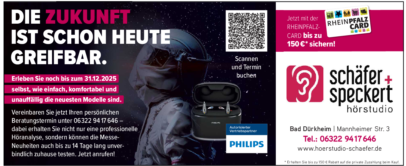 Die neueste Generation moderner Hörsysteme ist kleiner, robuster und klangstärker als je zuvor. Fortschrittliche KI, präzise Sensoren und perfekte Vernetzung sorgen dafür, dass Hören heute natürlicher, klarer und entspannter ist. Als einer der ersten Hörakustikbetriebe der Region hat das Hörstudio Schäfer Speckert bereits alle Neuheiten im Haus und ermöglicht es Interessierten, diese unverbindlich zu testen. Machen Sie sich selbst ein Bild und erleben Sie, wie viel moderner Hörkomfort bewirken kann: Gespräche werden lebendig, Musik klingt voller, und im Alltag genießen Sie wieder jedes Wort - fast, als wäre nichts im Ohr. Rufen Sie jetzt die Hörexperten aus Bad Dürkheim unter 06322 9417646 an und vereinbaren Sie Ihren persönlichen Testtermin.