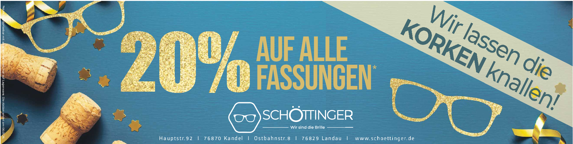 Das Augenoptikfachgeschäft „Schöttinger - Wir sind die Brille“ , Hauptstraße 92, lässt am Sonntag die Korken knallen. Hier gibt es 20 Prozent auf alle Fassungen – eine gute Gelegenheit, klare Sicht mit stilvollem Design zu verbinden.