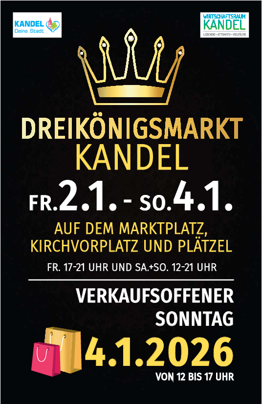 Kandel startet mit einem langen Einkaufswochenende und musikalischen Bühnenprogramm ins neue Jahr 2026. Vom 2. bis 4. Januar herrscht beim Kandeler Dreikönigsmarkt eine gemütliche Atmosphäre, wenn auf dem Marktplatz, Kirchvorplatz und dem schönen Kandeler Plätzel mit Fachwerkhauskulisse seiner erneut Ausstellerinnen und Aussteller mit ihren Verkaufs-, Essens- und Getränkeständen zum Flanieren und Verweilen einladen. Am Sonntag, 4. Januar, öffnen zusätzlich die Geschäfte von 12 bis 17 Uhr zum verkaufsoffenen Sonntag.