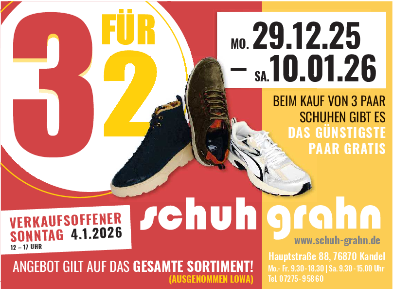 Der Kandeler Dreikönigsmarkt ist am Freitag von 17 bis 21 Uhr geöffnet, am Samstag und Sonntag jeweils von 12 bis 21 Uhr. Hier öffnen sonntags ab 12 Uhr die Kandeler Geschäfte ihre Türen und laden zu einem Einkaufsbummel in einzigartiger und entspannter Atmosphäre ein. Unter dem Königsmotto haben sich die teilnehmenden Geschäfte wieder einiges einfallen lassen: Das „Schuhhaus Grahn“, Hauptstraße 88, gewährt seinen Kundinnen und Kunden einen großen Preisnachlass auf das gesamte Sortiment: Beim Kauf von drei Paar Schuhen gibt es das günstigste gratis.