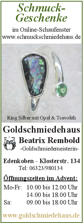 Seit 1993 fertigt die Goldschmiedemeisterin Beatrix Rembold mit ihrem Team individuelle Schmuckstücke in allen Preislagen. Die Palette reicht von Ringen, Ohrschmuck, Edelsteinketten bis hin zum Herrenschmuck. Auch fürs Weihnachtsfest hat das Goldschmiedehaus wieder außergewöhnliche Schmuckstücke für seine Kunden zu bieten. Im Onlineschaufenster der Premium-Goldschmiede unter www.schmuckschmiedehaus.de findet sich immer eine große Auswahl an aktuellen Schmuckstücken. Gutscheine vom Goldschmiedehaus sind auch ein schönes Geschenk. Natürlich ist man auch mit Reparaturen, Umarbeitungen und Anfertigungen nach eigenen Wünschen in dem Goldschmiedemeisterbetrieb bestens aufgehoben. Weitere Eindrücke, einen Blick auf die hellen, modernen Räume und die Werkstatt sowie eine genaue Anfahrtsskizze findet man auf der Firmen-Webseite www.goldschmiedehaus.de.