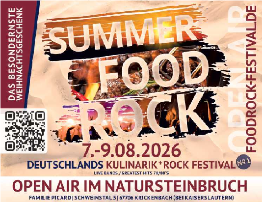 Scharff ist Initiator des Foodrock-Festivals, das von Fr 7.8. bis So 9.8.2026 zum 6. Mal im Steinbruch Picard bei Krickenbach zelebriert wird. Knapp 40 Profis – Star- und TV-Köche, Grill- und Barbecue-Weltmeister, Bäcker und Konditoren – geben sich ein Stelldichein. Gäste können Kochshows, Tastings und Workshops erleben, abends spielen Live-Bands „Greatest Hits“ der 70- und 80er. Neu dabei: Blues Busters Band und Dirty Deeds (AC/DC-Covers). Es stehen mehrere Ticketvarianten zur Verfügung, etwa mit Campen oder Hotelübernachtung und Shuttleservice – perfekte Geschenkidee für alle, die gutes Essen und gute Musik schätzen.