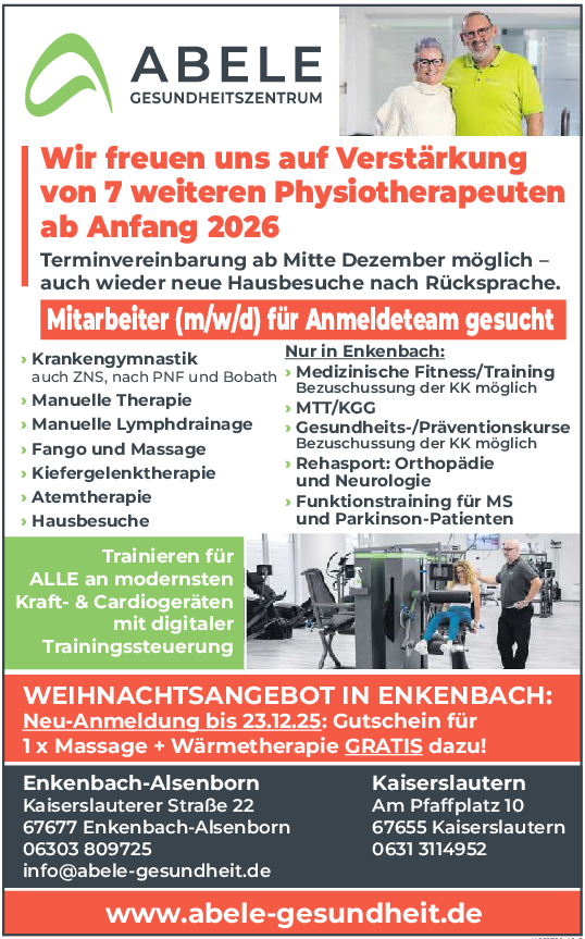 Seit 1998 gibt es das Gesundheitszentrum Abele in Kaiserslautern, in dem alle klassischen und modernen physiotherapeutischen Leistungen angeboten werden. 2014 kam die Praxis in Enkenbach-Alsenborn dazu und 2021 dann der Umzug ins neuerbaute Gesundheitszentrum, in dem neben den klassischen Behandlungen zudem auch medizinische Fitness, Rehasport und Gesundheitskurse angeboten werden. Dort gibt es die Möglichkeit für das Training an modernsten Geräten mit qualifizierten Trainern/Therapeuten und Sportwissenschaftlern auf Rezept, oder auch als Mitgliedschaft mit unterschiedlichen Abo-Modellen.