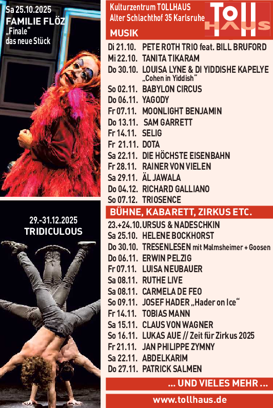 Tridiculous: „Das Tridiculous ABC“, Montag und Dienstag, 29. und 30. Dezember, jeweils 20 Uhr, Mittwoch, 31. Dezember, 21 Uhr. Geballte Kraft und Dynamik, Musikalität und eine ordentliche Portion Humor: das ist Tridiculous. Smarte Typen mit vielen Skills: Ob Breakdance, Aerial oder Slapstick, ob Beatbox, Strapaten oder Hand-auf-Hand, ob Gesang, Pole oder Comedy, die Jungs aus Berlin beherrschen ihr Fach, mixen ihr Können mit authentischer Spielfreude und kreieren so einzigartige Spektakel. Die drei internationalen Multitalente spielen all ihre Fähigkeiten. Schnell, spektakulär, sprunggewaltig - Tridiculous präsentieren eine rasante Show, die fasziniert, verzaubert und begeistert. red