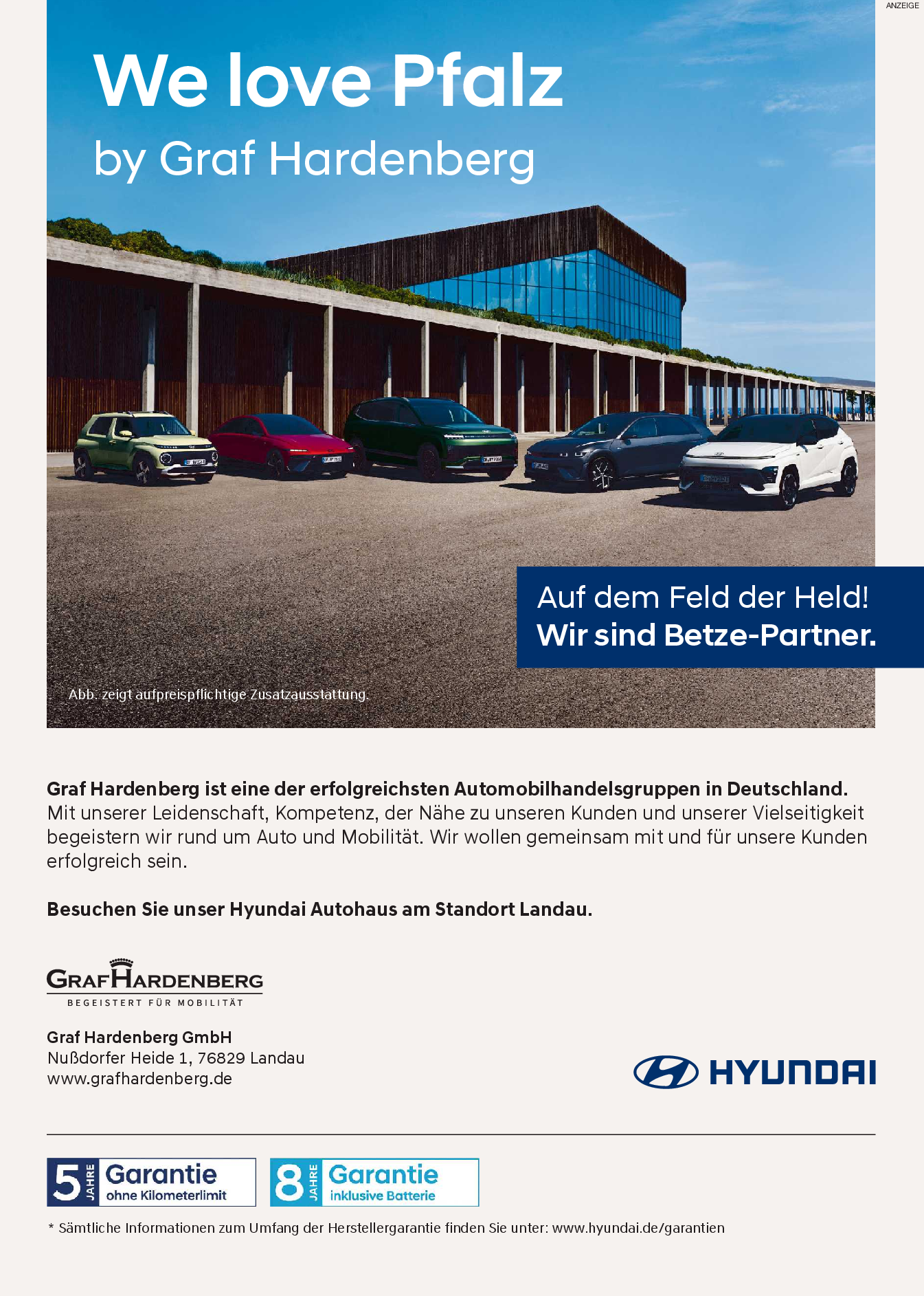 Bei der Umsetzung des Landauer Standorts mit den Marken Hyundai, Seat und Cupra war Geschäftsführer Frank Röder maßgeblich beteiligt. Mit der kontinuierlichen Stärkung der drei Marken sowie dem klaren Bekenntnis zur Region verfolgt die Graf Hardenberg Gruppe ein langfristiges Ziel: das Autohaus als modernen, starken und verlässlichen Mobilitätspartner in der Pfalz zu etablieren. Perspektivisch ist dem Unternehmen zufolge auch die Entwicklung eines weiteren Standortes nicht ausgeschlossen – ein klares Zeichen für das langfristige Engagement in der Pfalz. red/tkn