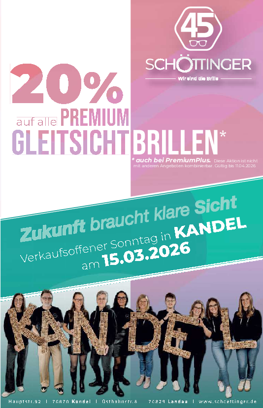 „Wir sind die Brille Schöttinger“, Hauptstraße 92, lädt am verkaufsoffene Sonntag von 12–17 Uhr zu einem entspannten Frühlingsnachmittag mit vielen Highlights ein. Die Besucherinnen und Besucher dürfen sich hier auf ein Gewinnspiel mit einem tollen Preis freuen. Zu gewinnen gibt es einen Parezzo Frühstücksgutschein für zwei Personen. Für alle Naschkatzen, die vor dem Ladengeschäft verweilen, gibt es kleine frühlingshafte Törtchen vom Café Theobald aus Herxheim.