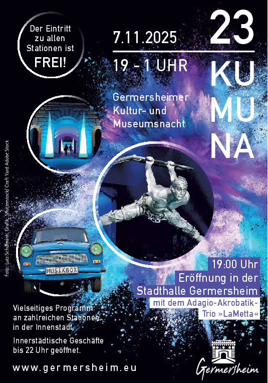 Zum 23. Mal präsentieren am Freitag, 7. November, in der KUMUNA von 19 bis 1 Uhr nachts die Germersheimer Museen, zahlreiche kulturelle Vereine und Institutionen, sowie traditionsgemäß auch viele Vertreter der Germersheimer Geschäftswelt, die vielfältige Kulturszene der Festungsstadt Germersheim. Die Besucherinnen und Besucher dürfen sich begeistern lassen von der kulturellen Erlebniswelt sowie sich inspirieren lassen vom umfangreichen Angebot der einzelnen Kulturnachtstationen. Seit 2001 hat sich die Veranstaltung ständig weiterentwickelt. Von ursprünglich 14 Stationen ist die KUMUNA auf mittlerweile weit über 30 Stationen gewachsen mit künstlerischen, musikalischen, abwechslungsreichen und bemerkenswerten Darbietungen mit dabei.