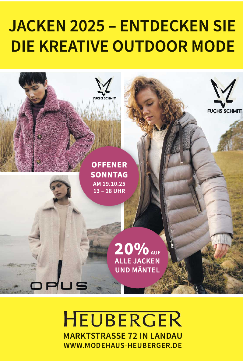 Am verkaufsoffenen Sonntag zum Fest des Federweißen, dem 19. Oktober, öffnet das Modehaus von 13 bis 18 Uhr. Egal ob sportlich, feminin, ausgefallen oder elegant bei Heuberger findet jetzt jede Frau das passende Herbst-Outfit.