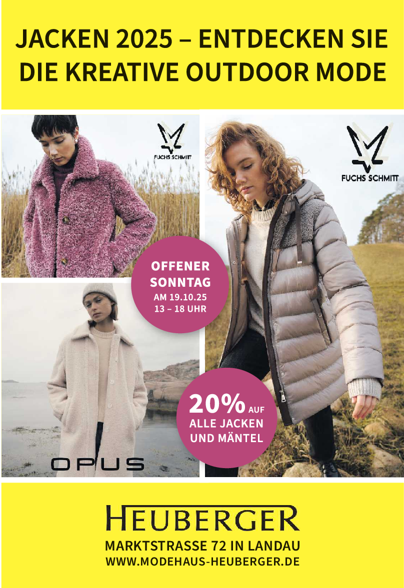 Das Modehaus Heuberger in der Marktstraße 72 in Landau gilt als zentrale Anlaufstelle für Frauen, die trendbewusste Mode lieben. Am verkaufsoffenen Sonntag zum Fest des Federweißen, dem 19. Oktober, öffnet das Modehaus von 13 bis 18 Uhr. Egal ob sportlich, feminin, ausgefallen oder elegant - bei Heuberger findet jetzt jede Frau das passende Herbst-Outfit. Das Modehaus mit Tradition kann mittlerweile auf mehr als 90 Jahre Geschäftsbestehen zurückblicken. Auf über 400 Quadratmeter Verkaufsfläche erwartet die Kundin eine individuell zusammengestellte Kollektion aus kreativen Newcomern und bekannten Modemarken.