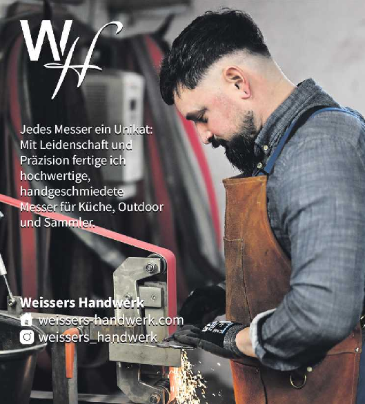 Manuel Weißer aus Neidenfels fertigt in seiner Manufaktur hochwertige Messer-Unikate. Mit Leidenschaft und Präzision entstehen handgeschmiedete Messer für die Küche, daneben auch Messer für Outdoor und Sammler. Weiẞers Produkte werden zunehmend nachgefragt in der gehobenen Gastronomie. Seine Messer gelangen in den Einsatz von Spitzenköchen, so im Sterne-Restaurant „Intens“ von Küchenchef und Inhaber Benjamin Peifer in Wachenheim. Wenn zum Beispiel der Gast ein 12-Gänge-Menü bestellt, findet sich beim Besteck zum Hauptgang ein solch hochwertiges Messer. Zu Manuel Weiẞers festen Kunden zählen u. a. auch das Gourmetrestaurant L.A. Jordan von Küchenchef Daniel Schimkowitch in Deidesheim und das 5-Sterne-Hotel Deidesheimer Hof von Küchenchef Stefan Neugebauer. Für die aufwendige Fertigung seiner Messer-Unikate benötigt Manuel Weißer zwischen 30 und 40 Arbeitsstunden. Bis ein solches Einzelstück schließlich geschaffen ist, werden bis zu 400 Lagen aus hochwertigem 10er Stahl zusammen geschmiedet.