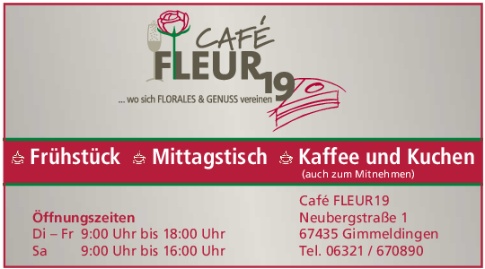 Das Café Fleur in Gimmeldingen (Neubergstraße 1) ist in die Frühlingssaison gestartet. In der Abteilung Confiserie locken Maikäfer und Marienkäfer aus Milchschokolade oder Zartbitter sowie kleine Trüffelkäfer mit Mandelflügeln. Bei den Torten mit Fruchtmousse bietet Konditormeister Steven Fink aktuell die Sorten Himbeere, Mango und Erdbeere. Der Gast hat die Wahl zum Genießen zwischen einem Stück von der Anschnitttorte vor Ort und einer kleinen Torte für Zuhause. An Obstkuchen gibt es Rhabarber mit Baiser und Erdbeere klassisch, aber auch feine Himbeertarte auf Buttermürbteig. Selbstverständlich ist weiterhin die große Auswahl an selbstgemachten Pralinen zum Verschenken erhältlich in den Sorten Nougat, Marzipan oder Trüffelpraline. end