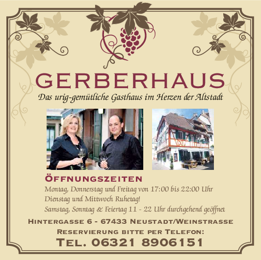 In der Neustadter Altstadt lädt das Gerberhaus seine Gäste ins gemütlich urige Fachwerk-Ambiente ein. Zwölf Jahre sind es mittlerweile, in denen der Küchenchef seine Gäste mit frischen Gerichten verwöhnt. Traditionell, regional und ideenreich werde gekocht, freut sich Barbara Landeck aus der Geschäftsführung. Pfälzer Spezialitäten, Flammkuchen, Salate, Käsespätzle oder Spinatknödel könnten die Gäste ebenso genießen wie Gerberhaus-Spezialitäten. Neben seiner normalen Speisekarte präsentiert der Küchenchef auch besondere Empfehlungen wie zur Jahreszeit passende Gerichte z. B. mit Hirsch, Kastanien oder Kürbis. Dazu zählen Serviettenknödel mit getrüffeltem Pilzragout und heimisches Hirschgulasch mit einer Preiselbeer-Portwein-Soẞe, so Barbara Landeck. Auch an die kleinen Gäste werde mit einigen Gerichten gedacht. end