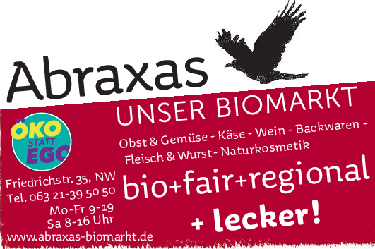 Der Abraxas Biomarkt in der Friedrichstraße 35 ist eine „Institution“ in Neustadt. Seit über dreißig Jahren schätzen die Kundinnen und Kunden hier ein breitgefächertes Angebot von inzwischen über 4000 verschiedenen Lebensmitteln, Naturkosmetika und sonstigen Naturwaren ausschließlich in Bio-Qualität. Das hier präsentierte Sortiment muss höchste Kundenansprüche in Bezug auf Nachhaltigkeit erfüllen. Als die große Stärke vom Abraxas Biomarkt erweist sich das vielfältige und regionale Sortiment an Bioprodukten: Gerade jetzt zu Herbstzeit lockt die Auswahl an regionalem Biowein. Auch die Obst- und Gemüseabteilung bietet besonders im Herbst und Frühjahr eine Reihe regionaler Erzeugnisse. Sehr begehrt bei der Kundschaft sind auch die vorzüglichen Brote und Backwaren der vier reinen Biobäckereien BioKaiser, Löwenzahn, Kleinsägmühlerhof und Olk - von hier können für Mittwoch frische glutenfreie Brote vorbestellt werden. In der großen Käsetheke hat man wahrlich die Qual der Wahl: ob Klassiker oder Spezialitäten, frisch aufgeschnitten oder am Stück - das entscheidet jeder Kunde für sich. Im Kühlregal werden verschiedenste Milchprodukte angeboten, aber auch vegane Milch- und Fleischalternativen.