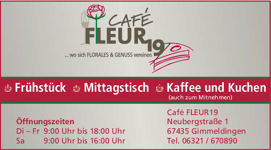 Für die Herbstsaison hat sich das Café Fleur in Neustadt-Gimmeldingen gut gerüstet. Mit seinem nunmehr exklusiven Standort Schupp im Blumenhaus (Neubergstraße 2) bringt Konditormeister Steven Fink frischen Wind in die Welt der Konditorei und zaubert eine wahre Vielfalt an zur Jahreszeit passenden Kreationen: „Speziell zum Herbst möchte unser Team die Gäste mit erlesenen Speisen und Delikatessen verwöhnen. Beliebt ist unsere herzhafte Kartoffelsuppe mit Wienerle oder unser leckerer Gemüse-Kürbis-Quiche mit Salat. Sehr gefragt ist Pfälzer Zwiebelkuchen mit neuem Wein. Bei den Torten bietet das Café Fleur eine Kastaniensahne mit eingelegten Kastanien und klassischem Mousse au Chocolat an. Der Herbstsaison geschuldet gibt es zudem eine Pfälzer Weincrèmetorte und Pfälzer Kirschtorte. Was die Confiserie angeht, so gibt es hier tolle Walnuss- und Nougat-Pralinenmischungen mit schönen Herbstmotiven sowie 60 Gramm schwere Marzipan-Nuss-Nougat-Pralinen in Kastanienform.