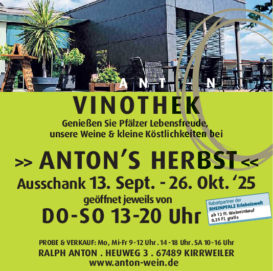 Im Weinhaus den Herbst mit allen Sinnen genießen, solches ist in den kommenden Wochen wieder möglich. Die Vinothek des Weinhauses Anton in Kirrweiler wird wie jedes Jahr zur Weinbar und lädt von Donnerstag bis Sonntag zum Verweilen ein. Hier schätzt der Gast die gemütliche Atmosphäre des Herbstausschanks und lässt sich von kleinen Köstlichkeiten und erlesenen Weinen des Weinguts Ralph Anton verwöhnen. „Genießen Sie die Herbsttage im gemütlichen Innenbereich der Vinothek oder auf der Terrasse mit Blick auf die Reblandschaft, empfiehlt Chefin Simone Anton. Die großen Glaselemente geben den Blick frei auf die Reben und machen die Vinothek zu einem lichtdurchfluteten Raum, der mit Lehmputz und Holzkombinationen eine moderne und ansprechende Umgebung für Weinliebhaber schafft. Anbei schon ein Ausblick auf den November: Am Wochenende vom 22. bis 23. November findet hier ein voradventlicher Markt statt. Getreu nach dem Motto „Alles was der Seele guttut“ wird im gemütlichen Flair eine breite Palette für alle Sinne angeboten. Beim Stöbern können die Besucher Weine, Sekte, Liköre und Brände als Weihnachtsgeschenk überaus kunst- und geschmackvoll verpacken lassen.