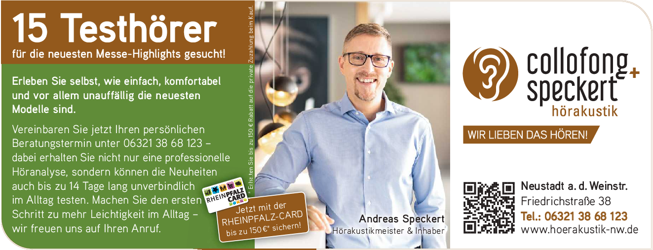 Die neueste Generation moderner Hörsysteme ist kleiner, robuster und klangstärker als je zuvor. Fortschrittliche KI, präzise Sensoren und perfekte Vernetzung sorgen dafür, dass Hören heute natürlicher, klarer und entspannter ist. Als einer der ersten Hörakustikbetriebe der Region hat das Hörstudio Schäfer Speckert bereits alle Neuheiten im Haus und ermöglicht es Interessierten, diese unverbindlich zu testen. Machen Sie sich selbst ein Bild und erleben Sie, wie viel moderner Hörkomfort bewirken kann: Gespräche werden lebendig, Musik klingt voller, und im Alltag genießen Sie wieder jedes Wort - fast, als wäre nichts im Ohr. Rufen Sie jetzt die Hörexperten aus Bad Dürkheim unter 06322 9417646 an und vereinbaren Sie Ihren persönlichen Testtermin.