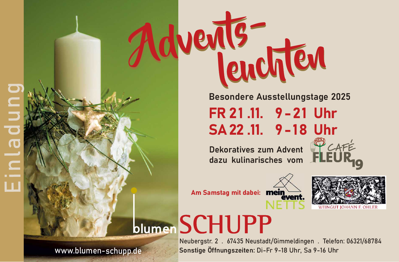 Die besonderen Ausstellungstage der „Adventsleuchten“ sind am Freitag, 21. November von 9 bis 21 Uhr, und am Samstag, 22. November von 9 bis 18 Uhr. Bis zum 1. Advent werden immer wieder neue Werkstücke gezaubert, die zum mehrmaligen Besuch einladen. Ein Rundgang durch die Advents- und Weihnachtsausstellung lohnt sich für alle, welche ihr Zuhause in eine Wohlfühloase verwandeln möchten. Übrigens: Das benachbarte Weingut Ohler und „Mein Event“ im Nett's Landhaus sind bei den „Adventsleuchten“ am Samstag mit Weinprobe und allerlei Leckereien mit dabei. end