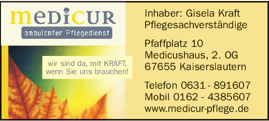Seit zwei Jahrzehnten ist der Pflegedienst Medicur ein verlässlicher Partner für patientenorientierte ambulante Pflege. „Es freut uns, dass uns unsere Kunden und behandelnden Ärzte so lange ihr Vertrauen geschenkt haben. Für die gute Zusammenarbeit bedanken wir uns herzlich und freuen uns darauf, sie fortzuführen“, sagen Inhaberin Gisela Kraft und Aline Stutzenberger. Das Wohlbefinden und die Zufriedenheit der Pflegebedürftigen sind für Medicur von größter Bedeutung. „Wir richten uns nach den persönlichen Bedürfnissen der Kunden, um ihre Selbstständigkeit in der häuslichen Umgebung so lange wie möglich zu erhalten“, erklärt Stutzenberger. Das Team berücksichtigt neben den körperlichen Bedürfnissen auch biografische Erfahrungen, Gewohnheiten und das soziale Umfeld. „Angehörige und Freunde sind ein wichtiger Bestandteil im Pflegeprozess. Wir nehmen ihre besonderen Herausforderungen wahr und unterstützen sie, wo immer es uns möglich ist“, so Stutzenberger. Auf Wunsch werden die Angehörigen aktiv in die Pflege einbezogen und bedarfsgerecht angeleitet. Die Anforderungen in der ambulanten Pflege entwickeln sich ständig weiter, daher nimmt das Team regelmäßig an Fort- und Weiterbildungen teil. Qualifizierte Wundtherapeuten mit umfassender Erfahrung in der Behandlung von Patienten mit chronischen Wunden, leisten eine fachgerechte, individuell abgestimmte Wundversorgung. Auch die Versorgung von Patienten mit künstlichen Zugängen für Nahrungsaufnahme oder Medikamenten übernimmt Medicur gerne. „Wir arbeiten in allen Bereichen eng mit den behandelnden Ärzten zusammen, die bei der Behandlungspflege gerne auf unsere Expertise zurückgreifen“, erläutert Stutzenberger.