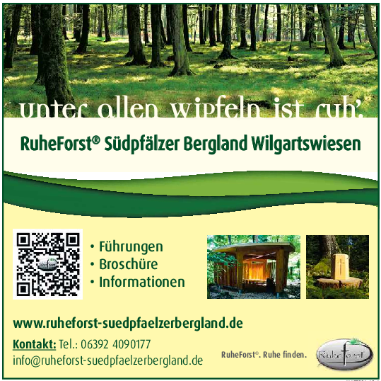 Für viele Menschen ist der Wald ein Sehnsuchtsort, der sie bewegt, zu dem sie sich hingezogen fühlen. Wer naturverbunden ist, wünscht sich am Lebensende vielleicht, eins zu werden mit der Natur, im Wald die letzte Ruhestätte zu finden und am Fuße eines alten, bemoosten Baumes beigesetzt zu werden. Die von der RuheForstⓇ GmbH neu herausgegebene Broschüre„Letzte Ruhe im Ruhe ForstⓇ nachhaltiges Gedenken“ gibt einen umfassenden Einblick in die ökologische Bedeutung von Wäldern, die für alle - aber auch für alles Leben auf dieser Erde - von unschätzbarem Wert sind. Sie zu schützen und für die Zukunft zu erhalten: dazu leisten RuheForsteⓇ einen erheblichen Beitrag, denn RuheForst-Wälder sind für den Zeitraum von 99 Jahren unter Schutz gestellt, die Bäume können in Ruhe alt werden. RuheForsteⓇ gibt es aktuell bundesweit an rund 90 Standorten. Das Gelände des RuheForstⓇ Südpfälzer Bergland Wilgartswiesen ist leicht begehbar, der wettergeschützte Abschiedspavillon und die Andachtstätte befinden sich in der Nähe des Parkplatzes, so dass auch, wer nicht gut zu Fuß ist, problemlos an Abschiedsfeiern teilnehmen kann. Diese können von den Angehörigen individuell gestaltet werden, ganz so, wie es sich der verstorbene Mensch vielleicht gewünscht hat, aber auch, wie es dem Bedürfnis der Trauernden entspricht. Für die Hinterbliebenen kann es sich erleichternd auf das Abschiednehmen und den Trauerprozess auswirken, wenn sie im Gedenken den letzten Weg für sich in guter Erinnerung behalten.