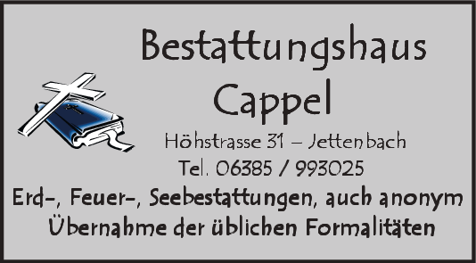 Walter Cappel ist ein einfühlsamer und fürsorglicher Helfer im Todesfall. Er übernimmt sämtliche Behördengänge, klärt den Ablauf der Bestattung oder Urnenbeisetzung ab und erledigt die damit erforderlichen Formalitäten. Das Bestattungswesen hat sich aus einer klassischen Schreinerei mit dem Schwerpunkt Möbelbau heraus entwickelt. In seiner Schreinerwerkstatt entstehen Möbelstücke, Schlafzimmereinrichtungen, Kinderzimmer und Küchen. Aber auch Treppen werden in der eigenen Werkstatt hergestellt und vor Ort eingebaut. Am liebsten verarbeitet der Schreinermeister Massivholz, weil das am besten für maßgeschneiderte Werke geeignet ist.