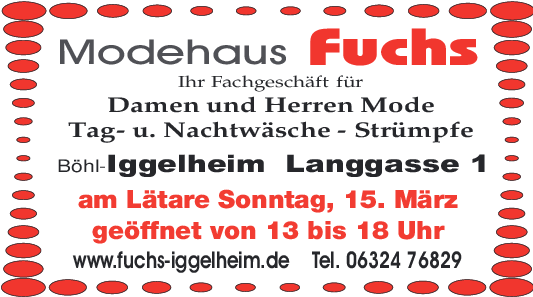 „Zum Lätare-Umzug kommen immer auch viele Leute von auswärts und nutzen die Gelegenheit, um sich ein Bild von der aktuellen Mode zu machen“, freut sich der gelernte Textil- und Großhandelskaufmann. Vorteilhaft sei, dass der Lätareumzug direkt am Schaufenster vorbeiführt und sich Umzugszuschauer durch die mit saisonaler Mode dekorierten Schaufenster zum Hereinschauen motivieren lassen. Wobei natürlich das Wetter eine Rolle spiele, da bei gutem Wetter viele Besucher kommen. „Bei schönem Wetter besteht größeres Interesse an Frühjahrs- und Sommermode“, blickt das Ehepaar auf jahrelanger Erfahrung zurück. Wobei Frauen gerne stöbern, während Herren gezielt kommen, wenn sie etwas brauchen und sich dann auch gerne beraten lassen. Die Öffnungszeiten: Montag, Dienstag, Donnerstag, Freitag 9 bis 12 Uhr sowie 14.30 bis 18 Uhr, Mittwoch, 9 bis 12 Uhr, Samstag, 9 bis 13 Uhr. Internet www.fuchs-iggelheim.de. acl