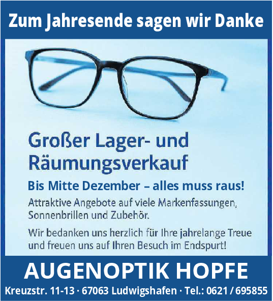 1983 machte sich Klaus Hopfe ebenfalls selbstständig. An seine Zeit im Geschäft im Hemshof erinnert er sich noch gerne zurück, ebenso auch an die Kunden, darunter auch von der BASF, deren Mitarbeiter er über 50 Jahre lang mit Industrieschutzbrillen versorgt hat. 1989 hatte Klaus Hopfe dann das heutige Geschäft in Friesenheim übernommen, während sein Vater noch am Standort am Goerdelerplatz blieb. Schließlich wurde im Jahr 2018 das Geschäft im Hemshof geschlossen. Die Kunden blieben jedoch dem Augenoptik-Geschäft Hopfe treu und wurden weiter am Standort in der Kreuzstraße fachkundig beraten und mit den auf sie abgestimmten qualitativ hochwertigen Brillen versorgt. Die Kunden schätzten das breite und vielfältige Sortiment, das alle notwendigen Brillen umfasst, angefangen von den ersten Brillen für Kinder bis hin zu Erwachsenen. Ob Sehhilfen bei Kurz- und Weitsichtigkeit und Gleitsichtbrillen - die Kunden wurden entsprechend ausgestattet. Auch Sonnenbrillen - eventuell auch in der entsprechenden Sehstärke - gab es in großer Auswahl.