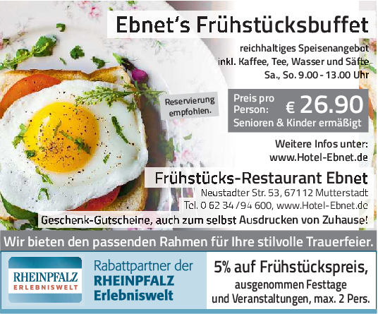 In das Traditionshaus in der Neustadter Straße 53 kommen gerne Gäste, die einen Geburtstag oder einen Hochzeitstag feiern, sich zum Stammtisch oder Betriebsausflug treffen, das Klassentreffen gerne mit einem Frühstück verbinden oder auch nur so um sich „kulinarisch zu verwöhnen“ berichtet Jürgen Ebnet. Dieses wird samstags und sonntags von 9 bis 13 Uhr, sowie an den meisten Feiertagen angeboten. Bei einer Buchung ab 20 Personen, nach Verfügbarkeit, gerne auch unter der Woche von montags bis freitags.