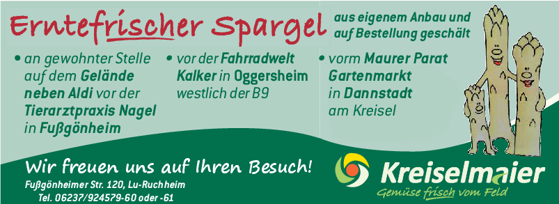 Die Kunden haben die Möglichkeit, den Spargel an drei Verkaufsstellen zu kaufen. Am heutigen Freitag, 27. März, öffnet die erste Verkaufsstelle in Fußgönheim vor der Tierarztpraxis Nagel. Ab Donnerstag, 2. April, werden zwei weitere Verkaufsstellen geöffnet: vor Fahrradwelt Kalker in Oggersheim im Gewerbegebiet Westlich B9 und in Dannstadt vor dem Maurer Parat Gartenmarkt am Kreisel. mmö