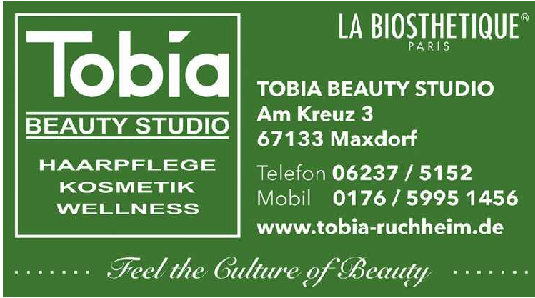 Kontakt: TOBIA BEAUTY STUDIO, Am Kreuz 3, Maxdorf, 06237 5152, 0176 59951456, www.tobia-ruchheim.de. red