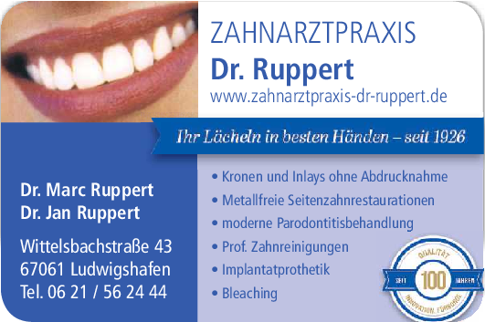 Die Zahnarztpraxis in der Wittelsbachstraße 43 wird seit ihrer Gründung von der Familie Ruppert geführt. Zahnarzt Dr. Jan Ruppert freut sich über die Unterstützung durch Sohn Marc bei dem großen Behandlungsspektrum der Praxis. Dazu zählt neben der Vorsorge inclusive professioneller Zahnreinigungen eine ästhetische Füllungstherapie, Keramikkronen und Brücken genauso wie Wurzelbehandlungen und das Versorgen von Implantaten. Darüber hinaus bietet die Praxis auch eine Schienentherapie bei Kiefer-, Gelenk- und Gesichtsschmerzen. Insgesamt ist die Praxis mit der Möglichkeit der Anwendung einer abdruck-freien digitalen Zahnmedizin auch technisch gut ausgestattet.