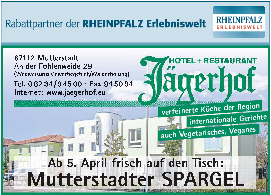 Im Hotel-Restaurant Jägerhof in Mutterstadt beginnt am 5. April die Spargelsaison. Neben der großen Bandbreite an regionalen und internationalen Speisen mit Fleischgerichten sowie einer vegetarischen Auswahl stehen auf der saisonalen Karte dann auch wieder leckere Spargelgerichte. Vom Cremesüppchen über Spargel mit Schwenkkartoffeln, wahlweise auch mit paniertem Schnitzel, Schweinefilet oder Rumpsteak sowie vegetarisch mit Kräuterpfannkuchen reicht das vielfältige Angebot. Neu auf der Karte ist Lachs mit Bärlauchnudeln.