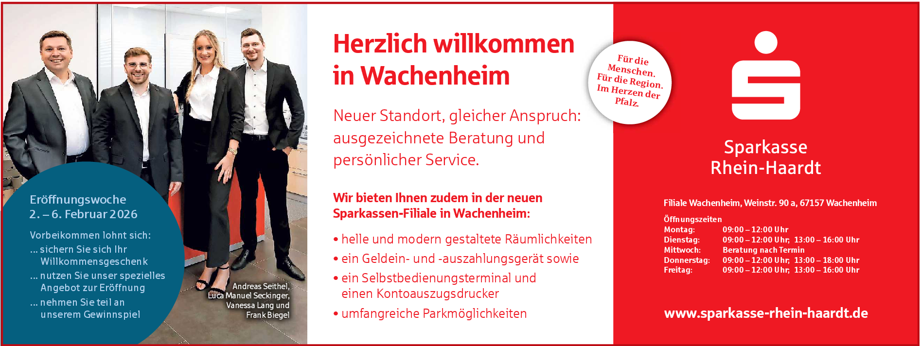 Andreas Seithel, Leiter Beratungszentrum Mittelhaardt in Deidesheim, sowie Luca Seckinger, Filialverantwortlicher in Wachenheim, freuen sich mit dem gesamten Team auf die persönlichen Gespräche. Mit dem Umzug an den neuen Platz verbindet die Sparkasse RheinHaardt moderne Beratungs- und Banktechnik mit einem zeitgemäßen Umfeld. Kundinnen und Kunden profitieren dabei von individueller Betreuung vor Ort ebenso wie von digitalen Angeboten – online, mobil unter www.sparkasse-rheinhaardt.de oder über die App Sparkasse. So begleitet die Sparkasse Rhein-Haardt die Menschen in der Region auf allen Wegen zuverlässig und kompetent. Anlässlich der Neueröffnung lädt die Sparkasse RheinHaardt in der Eröffnungswoche vom 2. bis 6. Februar herzlich zum Vorbeikommen ein. Für große und kleine Besucherinnen und Besucher hält das Team der Wachenheimer Filiale ein kleines Präsent parat. Bis Ende Februar gibt es für Kundinnen und Kunden der Filiale Wachenheim und jene, die es dort werden möchten, ein besonderes Geldanlage-Angebot mit dem sie zudem die Vereine Wachenheims unterstützen. red