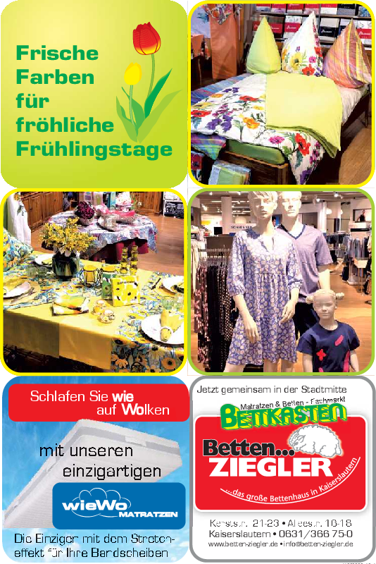 Die Menschheit freut sich auf den Frühling mit Sonnenstrahlen und einer bunten Welt. Die kann man sich nach Hause holen: Für das Schlafzimmer gibt es bei Betten Ziegler farbenfrohe Frühlingsbettwäsche in hellen Designs. Darüber hinaus witzige Motive für viele Gelegenheiten in luftigen Sommerqualitäten. „Luftig sind auch unsere leichten Sommerdecken zu überraschend günstigen Preisen bereits ab 39 Euro“, sagt Geschäftsführer Martin Lübben.