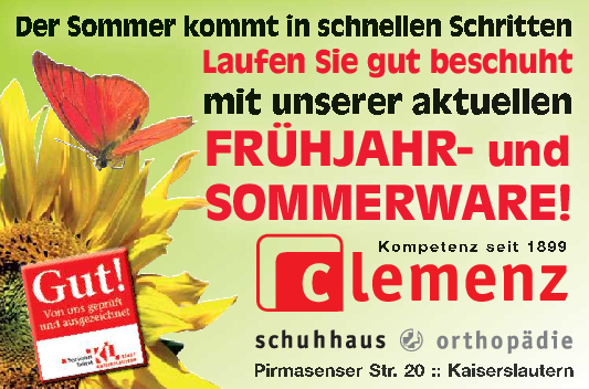 Der Sommer macht sich im Schuhhaus Clemenz GmbH in Kaiserslautern bereits bemerkbar. Die ersten Kollektionen sind eingetroffen und zeigen den diesjährigen Trend: Pastelltöne beherrschen die Saison und nicht zu übersehen ist die Farbe beige, die freundlich und beruhigend wirkt. Die neuen Modelle für Damen und Herren sind mit viel Liebe und Sorgfalt ausgewählt.